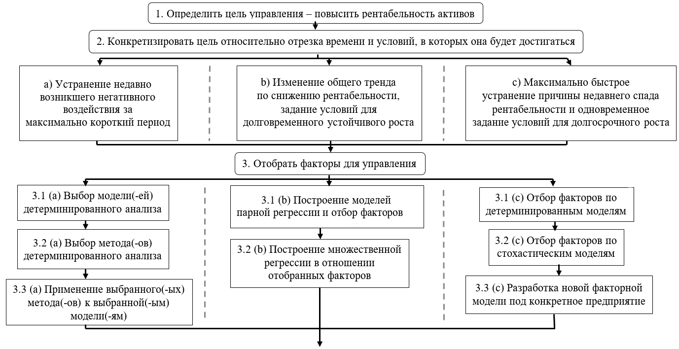 Первый этап предполагает постановку цели; менеджмент определяет ее так: повышение экономической эффективности через рост рентабельности активов, что особенно актуально для наукоемких отраслей. Цель конкретизируется с учетом временны́х горизонтов и условий, в которых она будет достигаться. Для стабильных периодов фокус на поддержании тренда, для кризисов — на нейтрализации негативных факторов. Различаются три сценария: