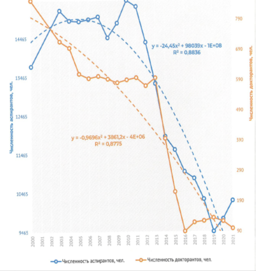 Почти синхронные изменения значений выпуска из аспирантуры и докторантуры с защитой соответствующей диссертации представляют интерес как предмет дальнейших исследований с целью выявить причины, нивелирующие различия в формате работы аспирантуры и докторантуры, в мотивации и необходимых затратах со стороны соискателей, как и прочие факторы различия данных форм научной деятельности.