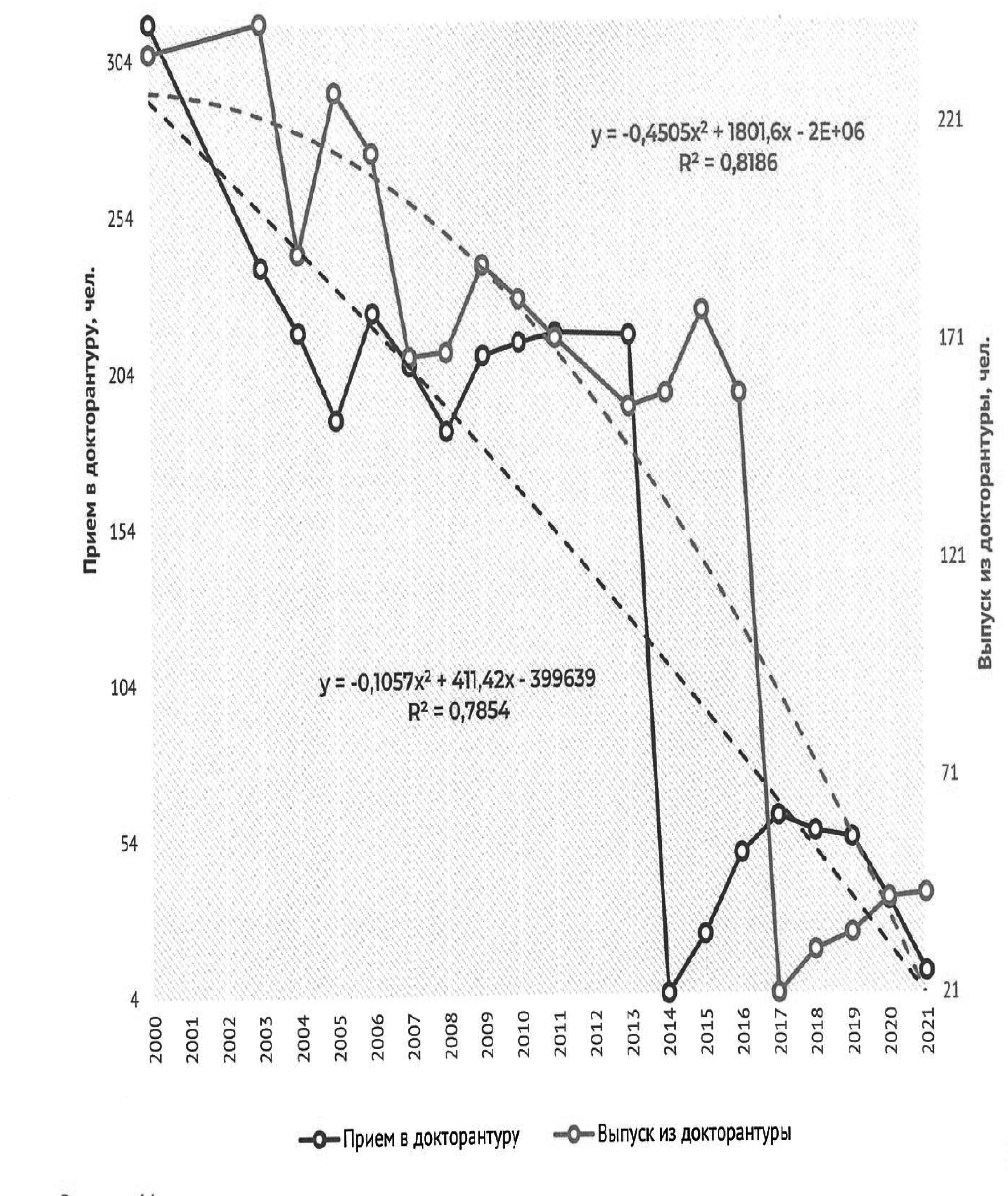 Принятый в 2012 г. Федеральный закон от 29.12.2012 № 273-ФЗ «Об образовании в Российской Федерации» не рассматривал докторантуру как вид образовательных программ. С 2014 г. деятельность докторантуры регулируется нормами Федерального закона от 23.08.1996 № 127-ФЗ «О науке и государственной научно-технической политике» (в ред. ФЗ от 22.12.2014 № 443-ФЗ и последующих редакциях). Именно в первые годы после принятия этого закона (2014—2015 гг.) наблюдались экстремально высокие значения соотношения численности выпуска и приема докторантов (39,8 и 7,7 соответственно). Ранее, с 2000 по 2013 г., это соотношение было относительно стабильным и составляло 0,89 (σ = 0,14).