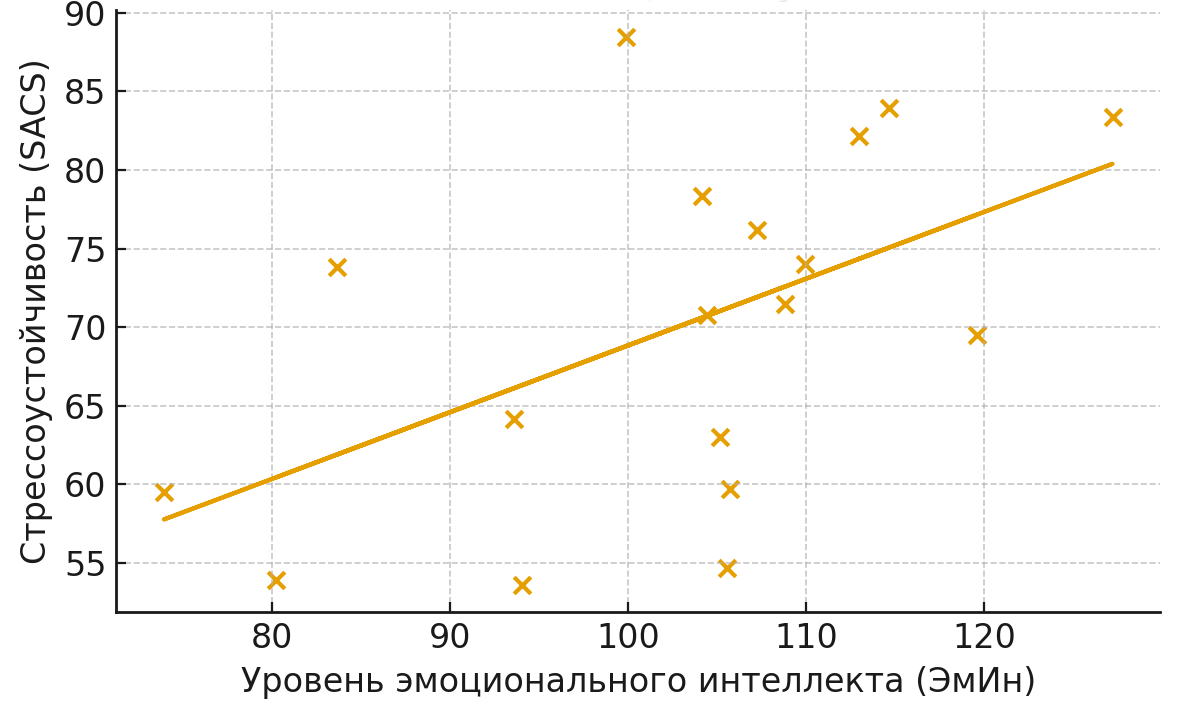Далее была выполнена количественная обработка: рассчитаны средние значения, стандартные отклонения, выполнен корреляционный анализ по методу Пирсона. Для визуализации данных построен график зависимости эмоционального интеллекта (EI) и стрессоустойчивости (см. рисунок). Динамика значений показывает четко выраженную положительную зависимость: линия регрессии отражает общую восходящую тенденцию, она выражается в том, что более высокие значения EI соответствуют более высоким показателям стрессоустойчивости. Сильная плотность данных вокруг регрессионной прямой указывает на устойчивость выявленной связи (что согласуется с коэффициентом r = 0,61). Вариативность данных остается умеренной (что отражено стандартными отклонениями EI SD ≈ 14,6 и SACS SD ≈ 11,9), но не нарушает общей модели взаимосвязи.
